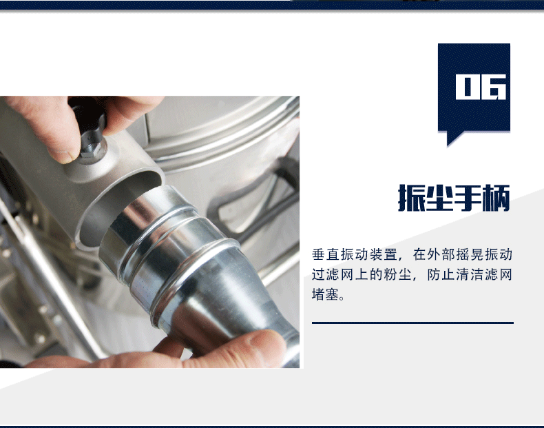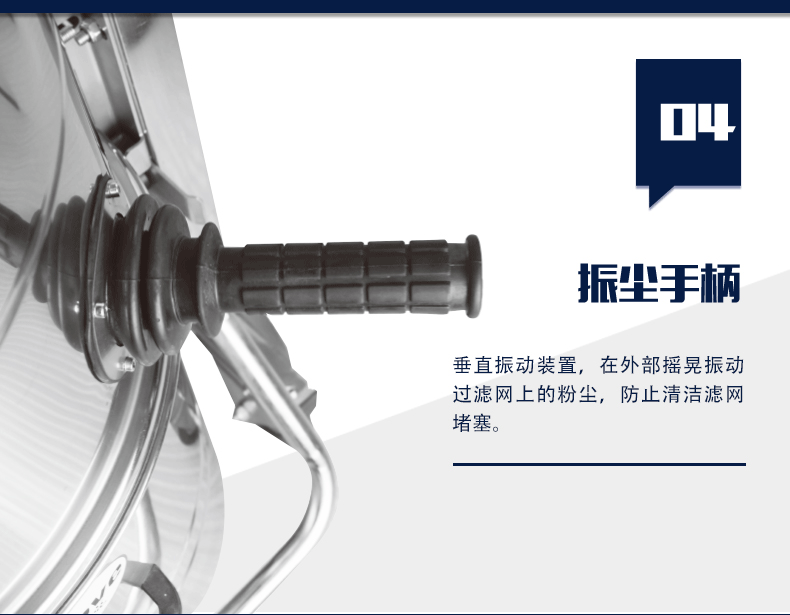 4. 過(guò)濾裝置 :聚酯涂層星型過(guò)濾器有效防止灰 塵堵塞,配加手動(dòng)震塵,外部搖晃即可完成內(nèi)部濾網(wǎng)的清理,方便快捷。